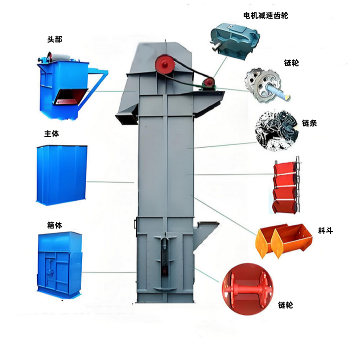 牽引構(gòu)件:包括鏈條、板鏈或環(huán)鏈,是帶動(dòng)料斗循環(huán)運(yùn)行的關(guān)鍵部件,直接影響提升能力和使用壽命。