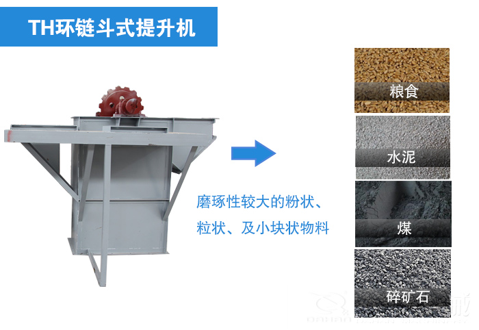 TH系列斗式提升機是一種常用的提升設(shè)備,其主要由由運動部分(料斗與牽引鏈條)、帶有傳動鏈輪的上部區(qū)段、帶有拉緊輪的下部區(qū)段、中間機殼、驅(qū)動裝置、逆止制動裝置等組成,該種類的斗式提升機采用混合式或重力卸料,挖取式裝料。TH型區(qū)別于TD型皮帶斗式提升機,其提升量更大、運轉(zhuǎn)效率更高,大輸送量5.4-2m3/h,大提升高度為50m。