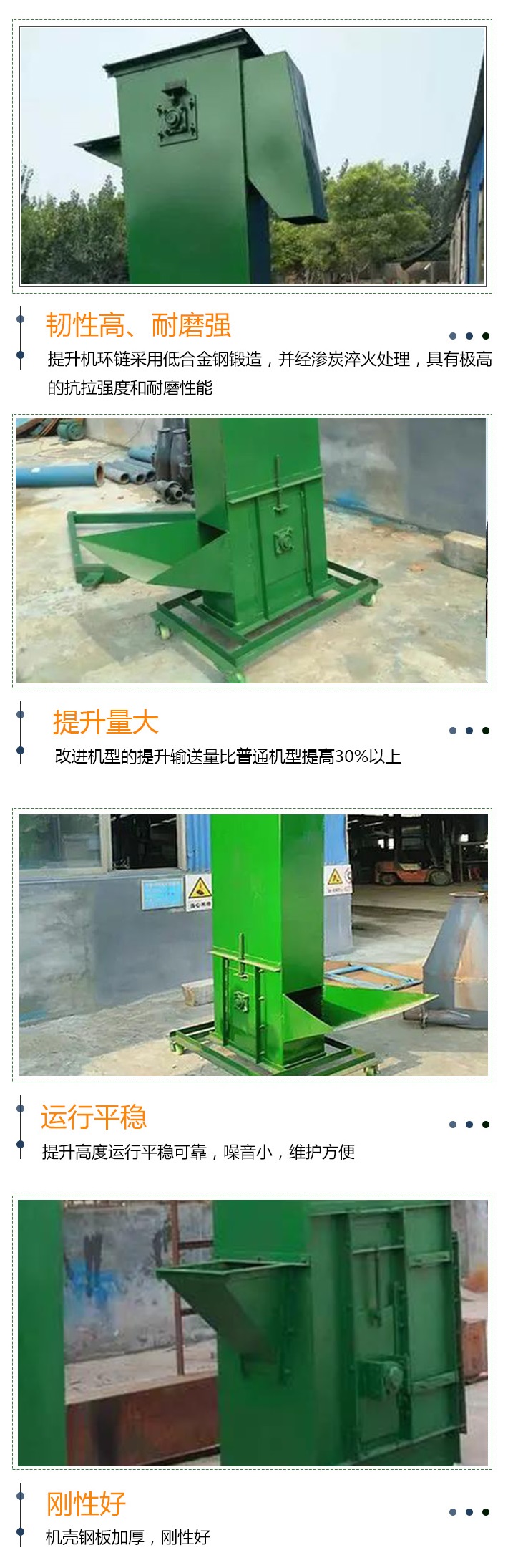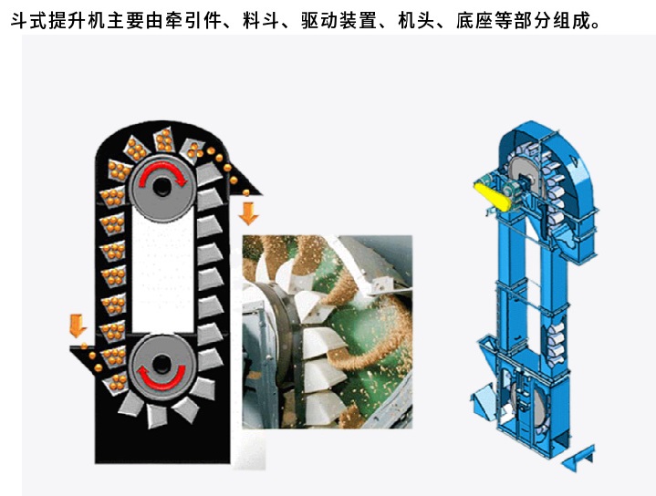 環(huán)鏈斗式提升機主要是依靠固定在鏈條上的料斗,將均勻流入尾部進(jìn)料口的物料從斗式提升機尾部不間斷地提升到斗式提升機頭部,并 然后從機頭出口卸下物料,完成整個物料提升過程。適合輸送堆積密度小于1.5t/m³易于掏取的粉狀、粒狀、小塊狀的低磨琢性物料 ,如:煤、水泥、碎石、砂子、化肥等,比普通機型提高30%以上。