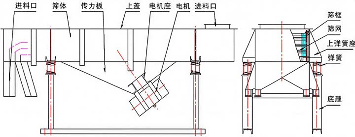 DZSF直線振動篩為雙振動電機驅(qū)動。當兩臺振動電機做同步、反向旋轉(zhuǎn)時,其偏心塊所產(chǎn)生的激振力在平行于電機軸線的方向相互抵消,在垂直于電機軸的方向疊為一合力,因此篩機的運動軌跡為一直線。兩電機軸相對篩面在垂直方向有一傾角,在激振力和物料自重力的合力作用下,物料在篩面上被拋起跳躍或向前作直線運動,從而達到對物料進行篩選和分級的目的。適用于粒度在0.074—5mm,含水量小于7%,無粘性的各種干式粉狀或顆粒狀物料的篩分。大給料粒度不大于10mm。