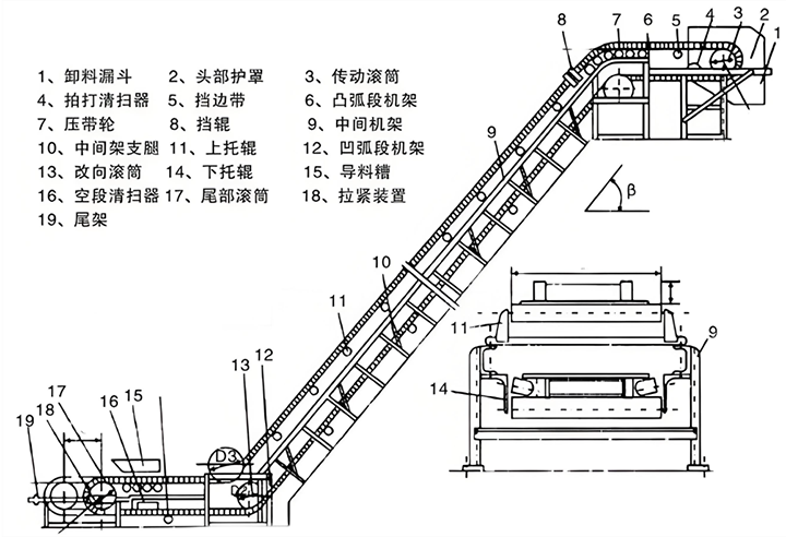 DTⅡ、TD75型皮帶輸送機(jī)由于輸送量大,結(jié)構(gòu)簡單,維護(hù)方便,成本低,通用性強(qiáng)等優(yōu)點(diǎn),而被廣泛地應(yīng)用在冶金、礦山、煤炭、港口、交通、水電、化工等部門,進(jìn)行裝車、裝船、轉(zhuǎn)載或堆積各種常溫狀態(tài)的松散密度為500~2500kg/m3各種散狀物料或成件物品.由單機(jī)或多機(jī)組合成運(yùn)輸系統(tǒng)來輸送物料,根據(jù)工藝要求可布置成水平或傾斜的形式,DTⅡ型皮帶輸送機(jī)除了可滿足水平或傾斜輸送要求外,還可采用帶凸弧段、凹弧段與直線段組合的輸送形式.輸送機(jī)允許輸送的物料塊度取決于帶寬、帶速、槽角和傾角,也取決于大塊物料出現(xiàn)的頻率.該皮帶輸送機(jī)適用的工作環(huán)境溫度一般為-25~+40℃.我公司還生產(chǎn)輕型皮帶輸送機(jī)和移動式皮帶輸送機(jī).